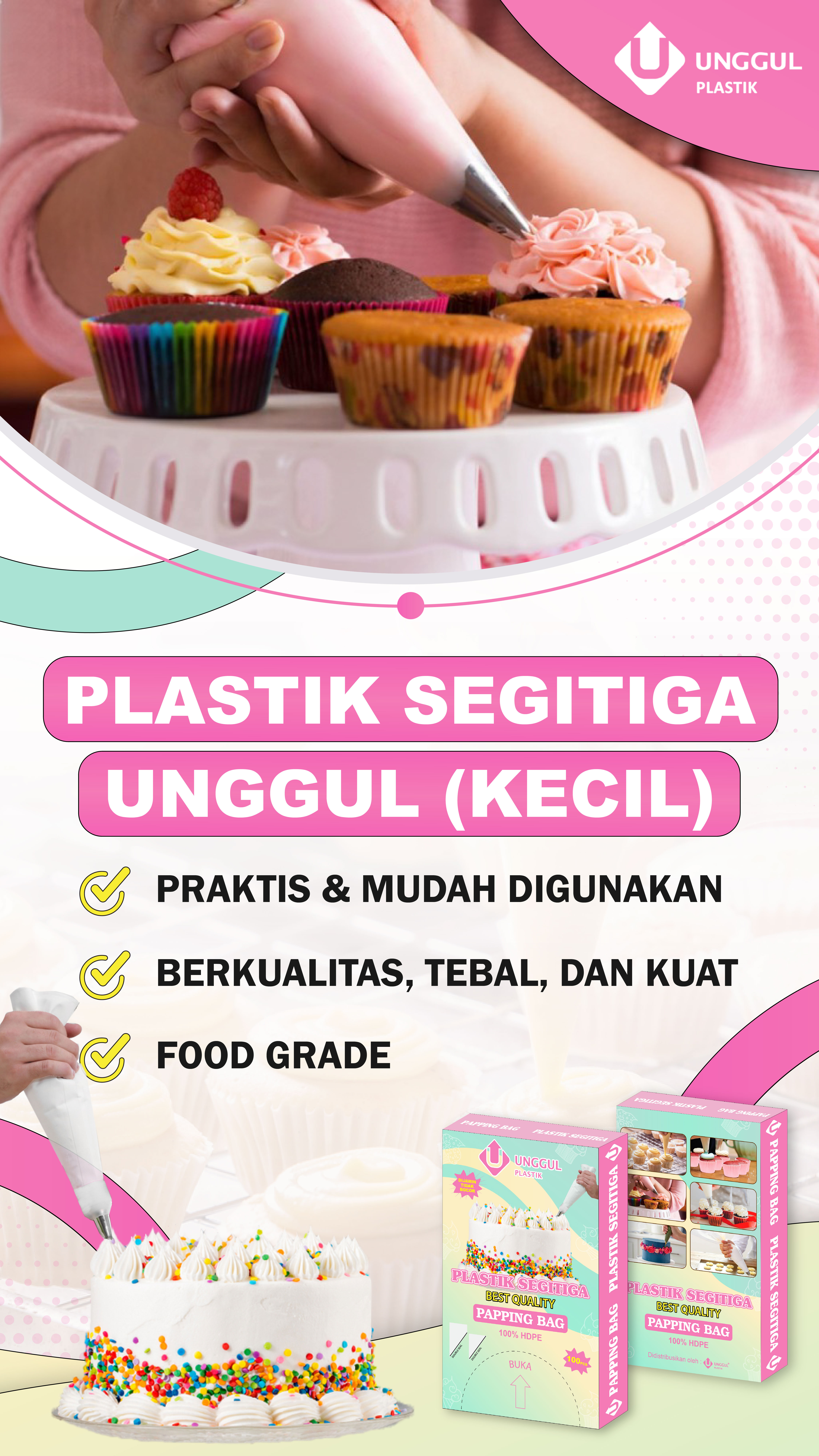 Plastik Segitiga Unggul adalah pilihan tepat untuk menghias kue dengan sentuhan profesional. Terbuat dari bahan 100% HDPE berkualitas tinggi, plastik ini kuat, lentur, dan tidak mudah sobek sehingga nyaman digunakan untuk berbagai kreasi dekorasi kue, seperti butter cream, cokelat leleh, atau krim lainnya. Dengan desain praktis dan higienis, setiap lembar plastik mudah diisi dan dipotong sesuai kebutuhan ujung spuit. Hadir dalam kemasan rapi dan modern, Plastik Segitiga Unggul membantu Anda menciptakan hasil hiasan kue yang rapi, indah, dan presisi.